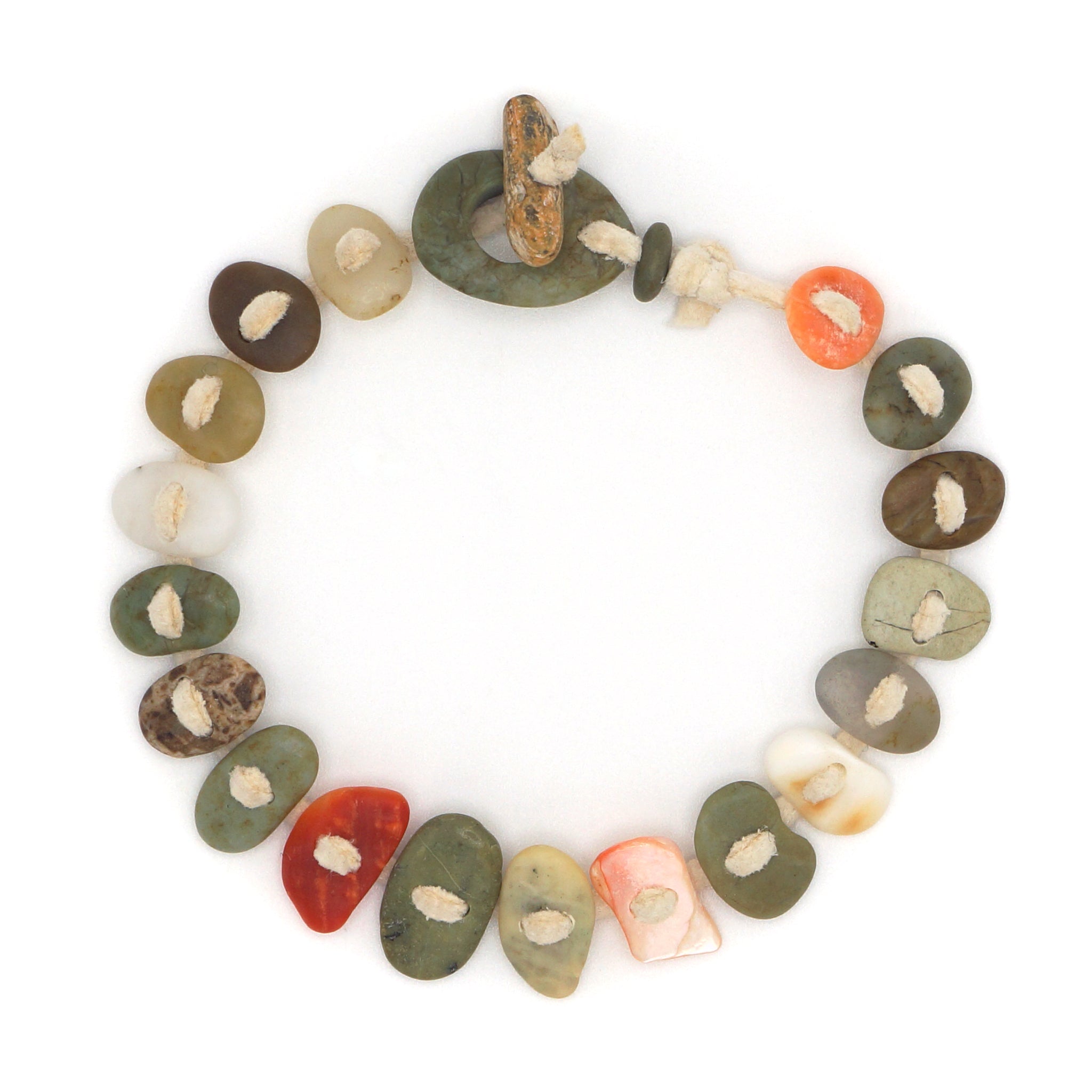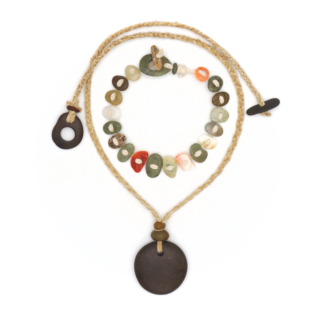 This sweet bracelet has a mix of hard stones and shells collected from the shores of Central California. It has a hand carved toggle clasp closure. It is strung on our deerskin leather that we tan and hand cut at home.