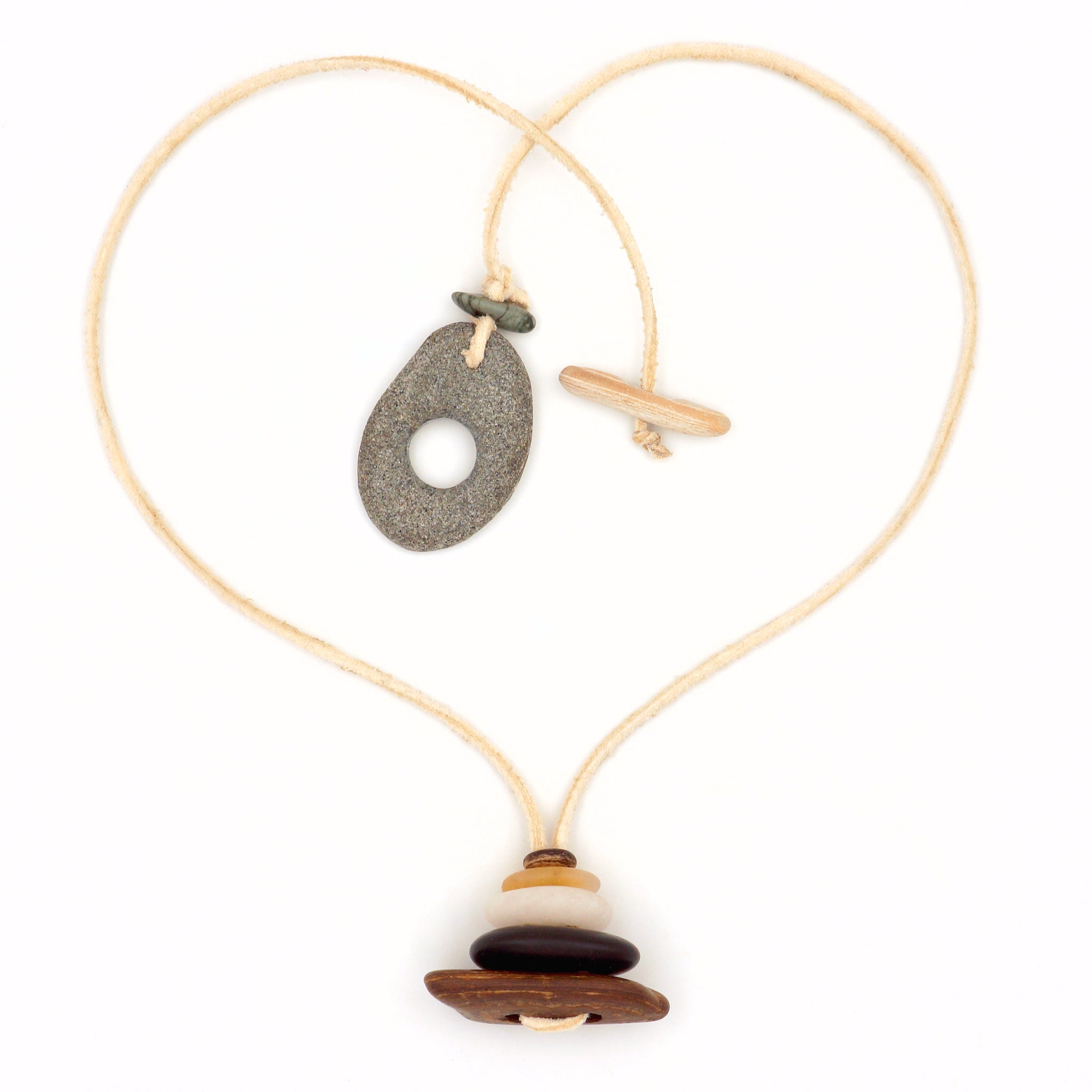 The necklace is 18 1/2" inches long with a hand carved stone toggle clasp.